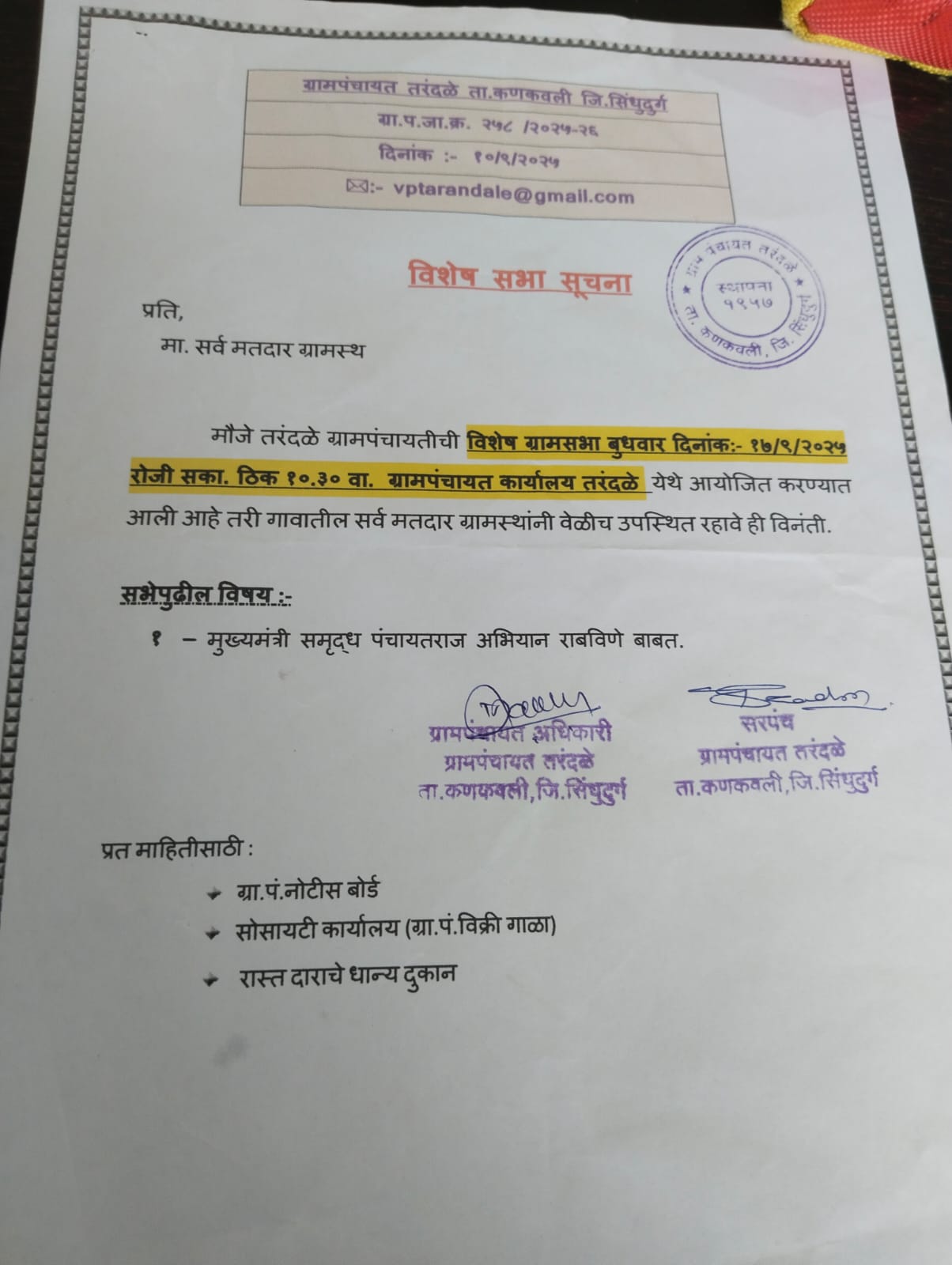 ग्रामपंचायत तरंदळे निर्मल ग्राम , लोकराज्य गाव , तंटामुक्त गाव पुरस्कार प्राप्त जन्म , मृत्यू , विवाह नोंदणी कार्यालय